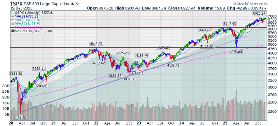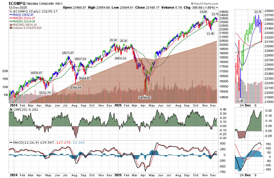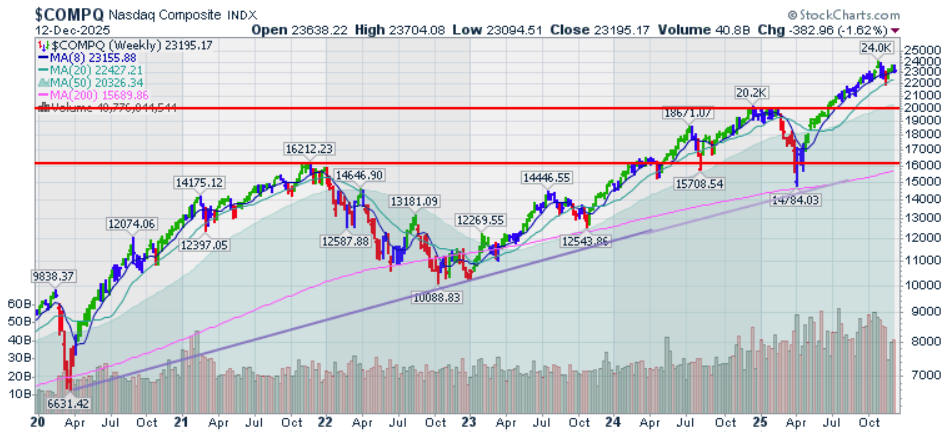 As can be seen in the above weekly charts of the NASDAQ and the S&P 500, the two indices remain above the 8- and 20-week simple moving average lines. Caution is advised as the underlying economic data is weakening.